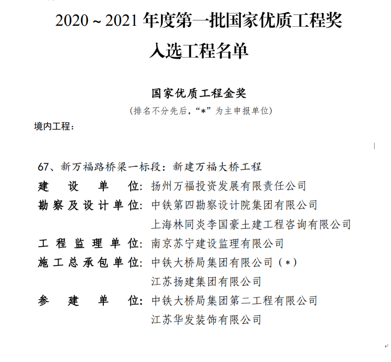 近日,“2020-2021年度第一批國家優(yōu)質(zhì)工程獎評選結(jié)果”揭曉,由城控集團萬福公司承建的新建萬福大橋工程榮獲“國家優(yōu)質(zhì)工程獎”殊榮。這是該工程繼“中國建筑工程裝飾獎(建筑幕墻類)”后,獲得的又一項國家級大獎。