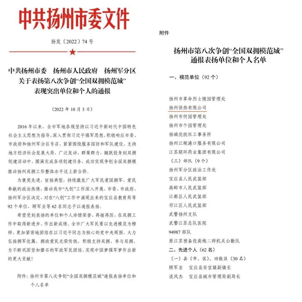 近日,揚(yáng)州市市委、市政府、軍分區(qū)印發(fā)表彰決定,揚(yáng)州供熱有限公司榮獲第八次爭(zhēng)創(chuàng)“全國(guó)雙擁模范城”表現(xiàn)突出單位。供熱公司始終把雙擁工作當(dāng)作新時(shí)期凝聚軍心民心、加快經(jīng)濟(jì)發(fā)展的一項(xiàng)重要工作來(lái)落實(shí),求真務(wù)實(shí),開拓創(chuàng)新,為我市成功實(shí)現(xiàn)爭(zhēng)創(chuàng)全國(guó)雙擁模范城“八連冠”目標(biāo)奠定了堅(jiān)實(shí)的基礎(chǔ)。