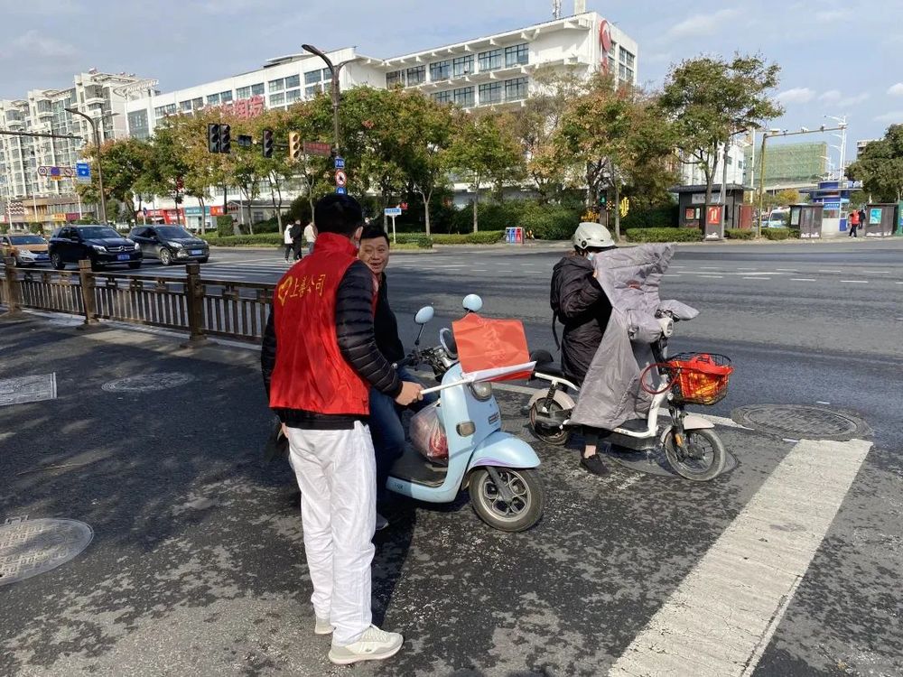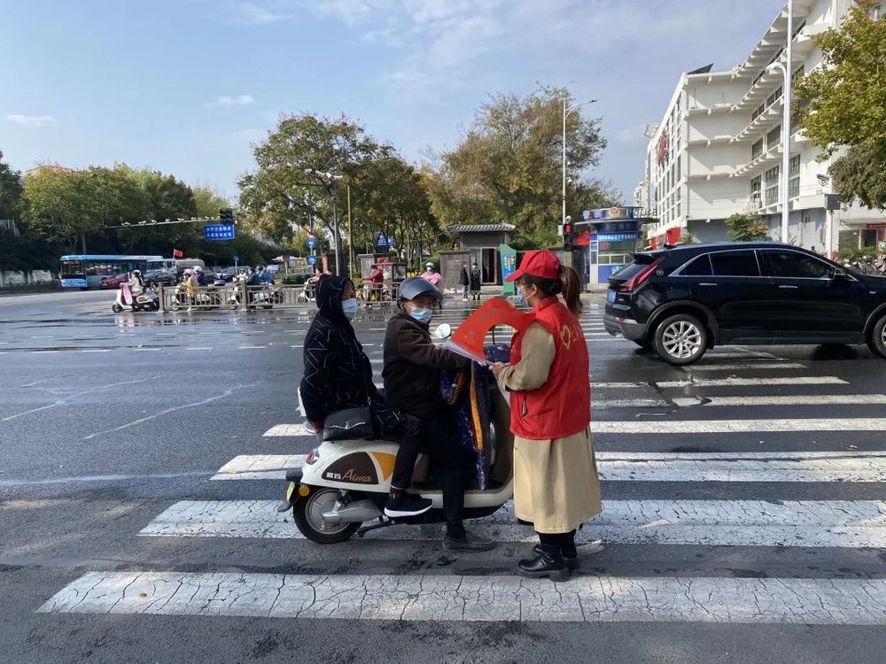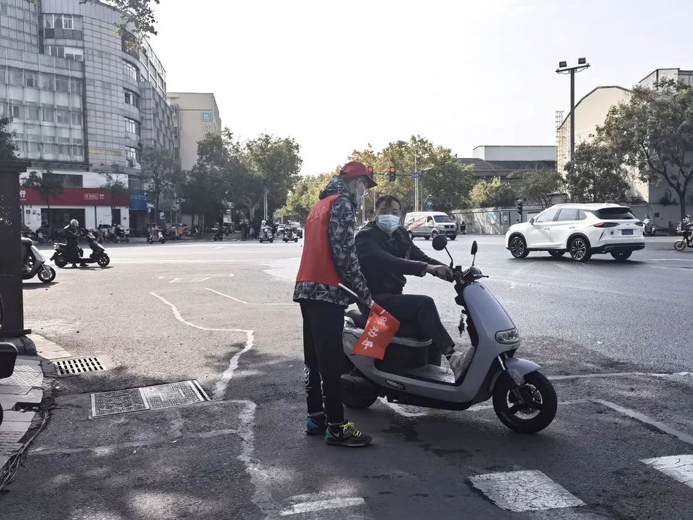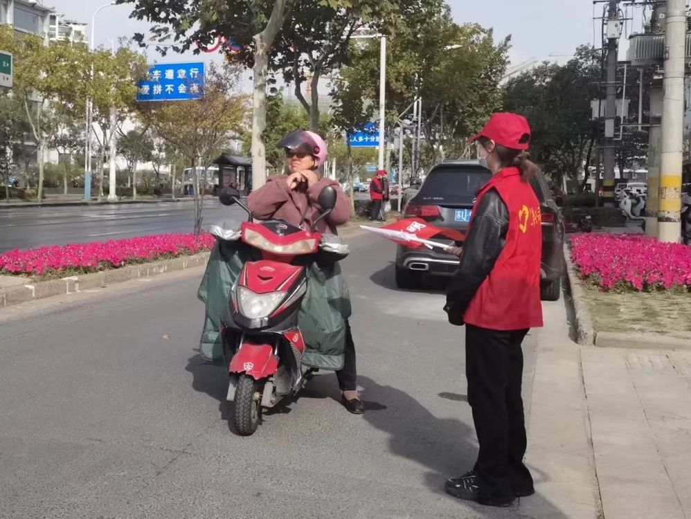 在路口,志愿者身穿紅色馬甲,手拿文明勸導小紅旗,以文明的語言和親切的態(tài)度,對越過停止線停車、不佩戴安全頭盔騎行、逆向行駛等不文明交通行為進行及時耐心的勸導,告知其危險性,引導行人安全通過人行橫道。同時,如有腿腳不方便的老人、提重物的行人,也會熱心上前提供幫助,并提醒他們注意交通信號燈,安全過馬路,遇有人問路,志愿者也會耐心指引。