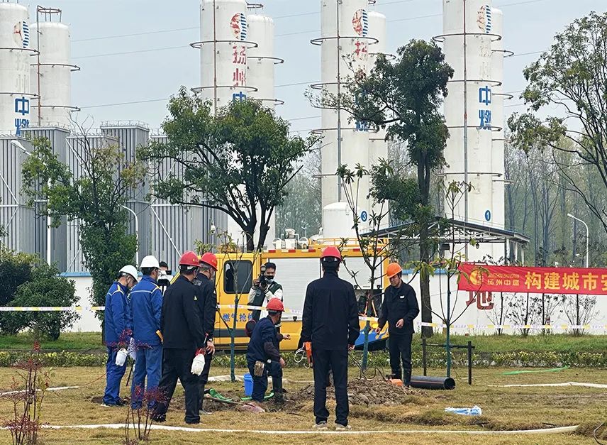 演練模擬楊廟LNG儲(chǔ)備站站外埋地NG壓力管道被第三方施工時(shí)破壞,造成燃?xì)庑孤┮鸹鹎椤J┕と藛T立即向揚(yáng)州中燃公司客服熱線報(bào)警,揚(yáng)州中燃公司接報(bào)后通知搶修人員趕赴現(xiàn)場(chǎng),同時(shí)向110報(bào)警請(qǐng)求支援。揚(yáng)州中燃公司搶修人員到達(dá)現(xiàn)場(chǎng)第一時(shí)間實(shí)施警戒,進(jìn)行先期處置,并將現(xiàn)場(chǎng)情況逐級(jí)向企業(yè)主要負(fù)責(zé)人匯報(bào)。企業(yè)主要負(fù)責(zé)人立即啟動(dòng)應(yīng)急預(yù)案一級(jí)響應(yīng)并趕赴現(xiàn)場(chǎng),同時(shí)向揚(yáng)州市應(yīng)急、住建、市場(chǎng)監(jiān)管等部門報(bào)告現(xiàn)場(chǎng)情況。