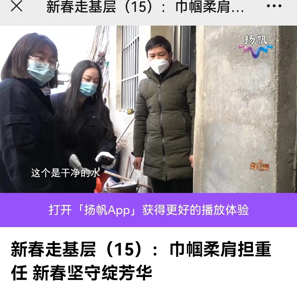 近日,家住楊廟村中林組的一位戴師傅給揚(yáng)州電視臺打電話,希望電視臺幫他表揚(yáng)長江水務(wù)江源黨支部“561”供水服務(wù)隊(duì)。揚(yáng)州電視臺“新春走基層”欄目組對此事進(jìn)行了采訪報道,攝制了《巾幗柔肩擔(dān)重任 新春堅(jiān)守綻芳華》專題片,反映了“561”供水服務(wù)隊(duì)傾情服務(wù)用戶,無懼嚴(yán)寒守護(hù)居民安全用水的敬業(yè)奉獻(xiàn)精神。