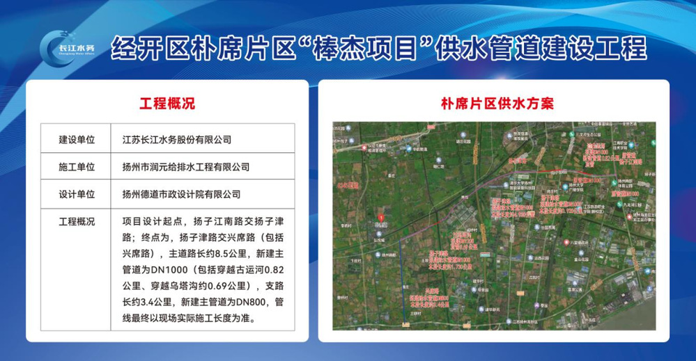 “棒杰項(xiàng)目”是揚(yáng)州經(jīng)濟(jì)技術(shù)開發(fā)區(qū)重點(diǎn)招商引資項(xiàng)目,為配合項(xiàng)目建設(shè),長(zhǎng)江水務(wù)高度重視,迅速部署,成立工作專班積極推進(jìn)項(xiàng)目建設(shè)。目前,樸席片區(qū)“棒杰項(xiàng)目”專項(xiàng)供水管道建設(shè)設(shè)計(jì)起點(diǎn)為揚(yáng)子江路與揚(yáng)子津路交叉口,設(shè)計(jì)終點(diǎn)為興席路與春江路交叉口。其中,擬在揚(yáng)子津路(邗江路-興席路)新建DN1000供水管道約8.5公里,概算投資7000萬元。