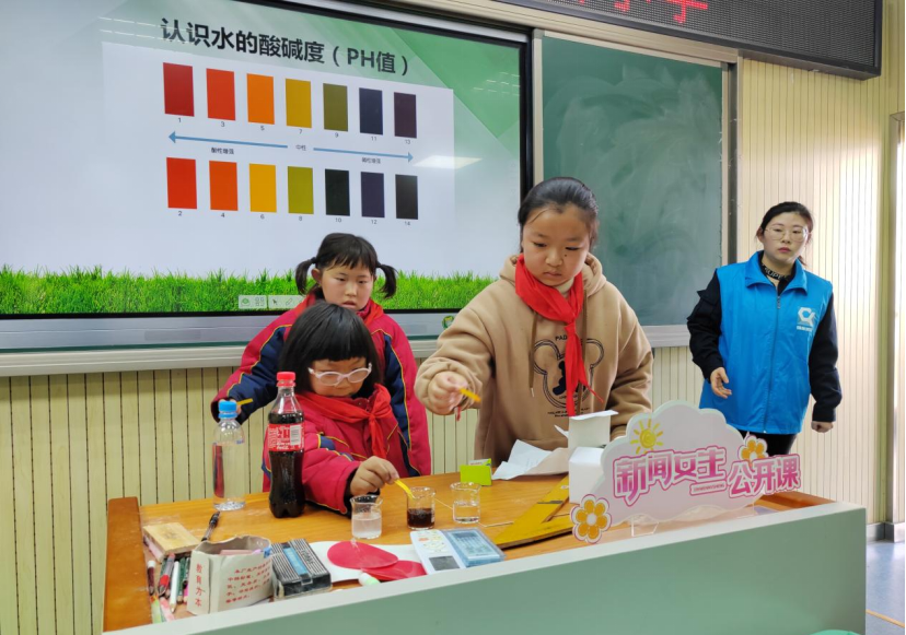 隨后,志愿者根據(jù)水的酸堿度這一知識點(diǎn),鼓勵同學(xué)們親自走上講臺動手做實(shí)驗(yàn),分別用試紙測試自來水、飲料、肥皂水的酸堿度并作對比,既增加了課堂趣味性,也鞏固了課堂所授知識點(diǎn)。