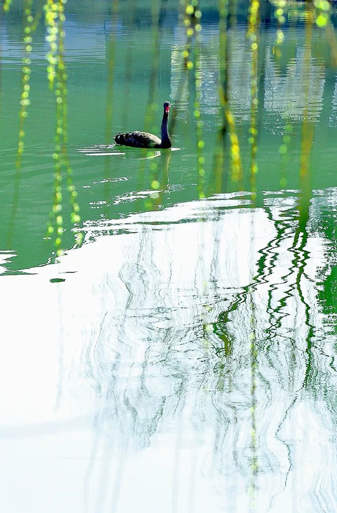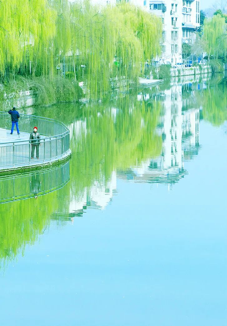 一棵棵柳樹臨水自照,不知是水滋潤了柳,還是柳明麗了水。
