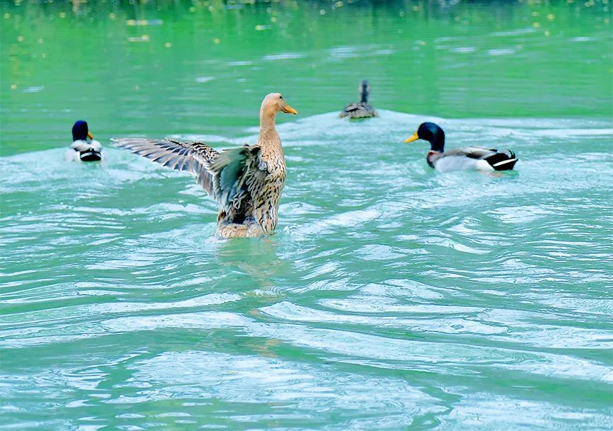 春風(fēng)里,陽光下,湖中水鳥或游弋劃波,或追逐嬉戲,繪就出一幅早春生態(tài)畫卷。