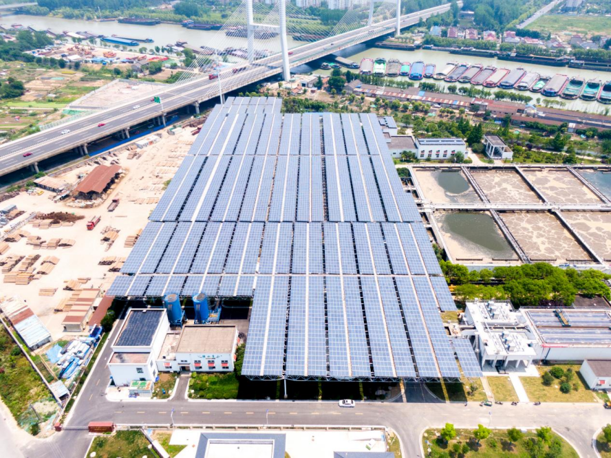 圖注:全國首批、江蘇首家建成投產(chǎn)的“光伏+水務(wù)”項目(湯汪污水處理廠電站)