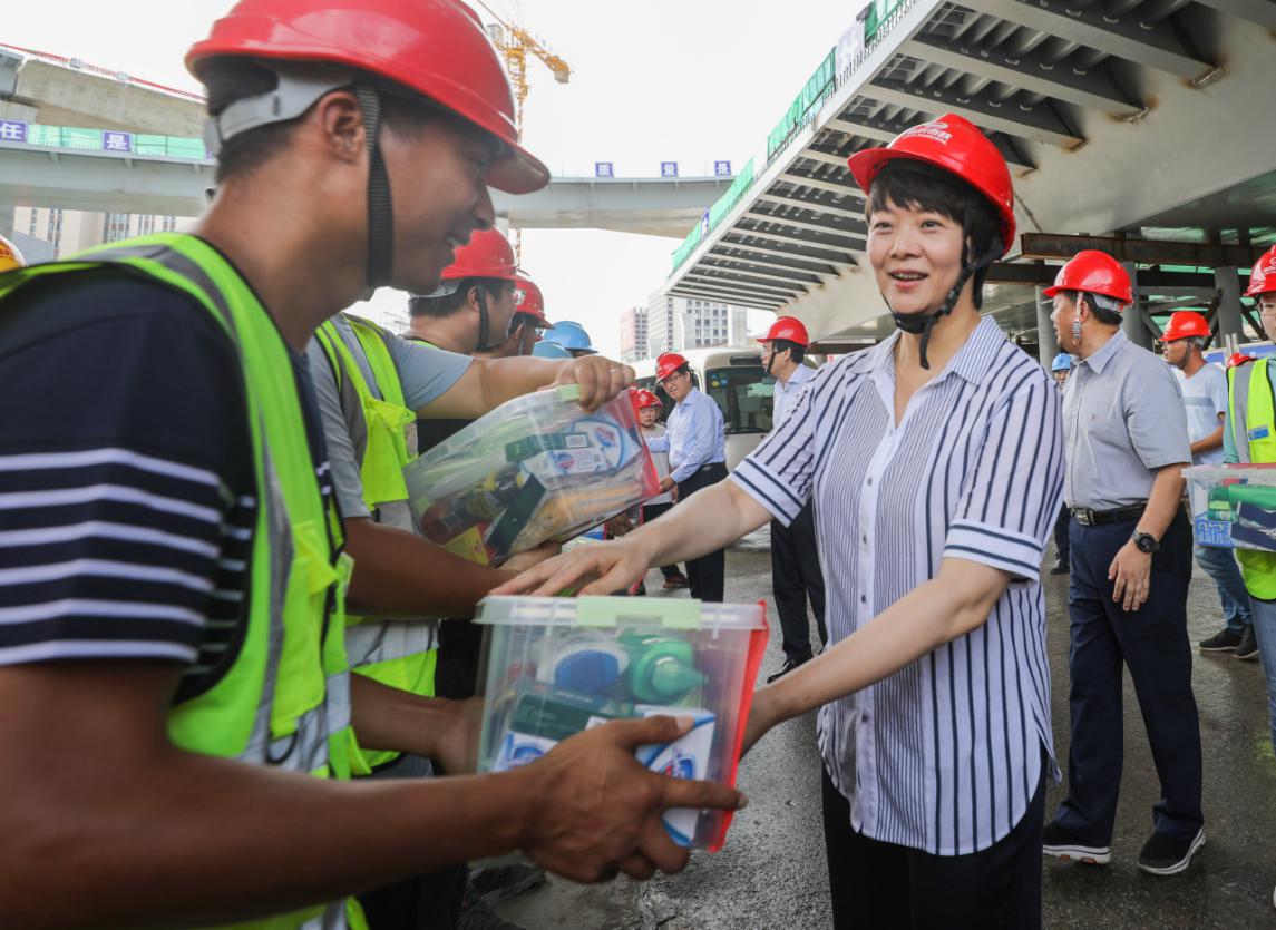 張寶娟一行實地察看了國泰創(chuàng)新中心、潤揚快速路、長江水務(wù)和揚州古城保護成果展示館,詳細了解項目建設(shè)情況。在潤揚路快速化改造工程江陽路互通立交施工現(xiàn)場,張寶娟給一線的工人們送上防暑物品。她囑咐企業(yè)負責人,高溫下連續(xù)工作非常辛苦,要確保高溫天氣作業(yè)安全和工程質(zhì)量,科學合理安排工時,做好防暑降溫工作,確保如期完成工程建設(shè),早日惠及揚州人民。