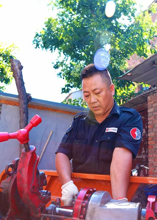 8月18日,為避開高溫天氣,管道安裝工仲飛清晨5點多準(zhǔn)時到達駐點,和伙伴們完成備料備件后,迎著朝霞趕赴揚州老城區(qū)北講經(jīng)墩居民家中。由于完全是戶外曝曬作業(yè),他身上的工作服濕了又干,干了又濕,泛起層層白色鹽霜。
