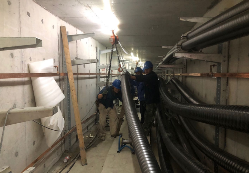 為了確保工程安全有序進(jìn)行,電纜敷設(shè)前,電力人員對每個井位的地形、地貌都要進(jìn)行仔細(xì)勘察,并對電纜下井地點進(jìn)行詳細(xì)安排。電纜敷設(shè)期間,每天有80多名工人在現(xiàn)場,他們借助機械,將電纜從沉井滑入電力管廊,再借助機械輸送到安裝地點。電纜敷設(shè)時,每隔一定距離串聯(lián)一臺電纜輸送機,每兩臺輸送機之間布置若干電纜滑車。電纜如果需要轉(zhuǎn)向,則會配備電纜轉(zhuǎn)角滑車。在敷設(shè)過程中,為保證電纜頭始終處于拉直狀態(tài),還設(shè)有專人負(fù)責(zé)電纜頭牽引,并觀察各個電纜輸送機和滑車的運行情況,以防止敷設(shè)中電纜蹦出而損壞電纜保護(hù)套。