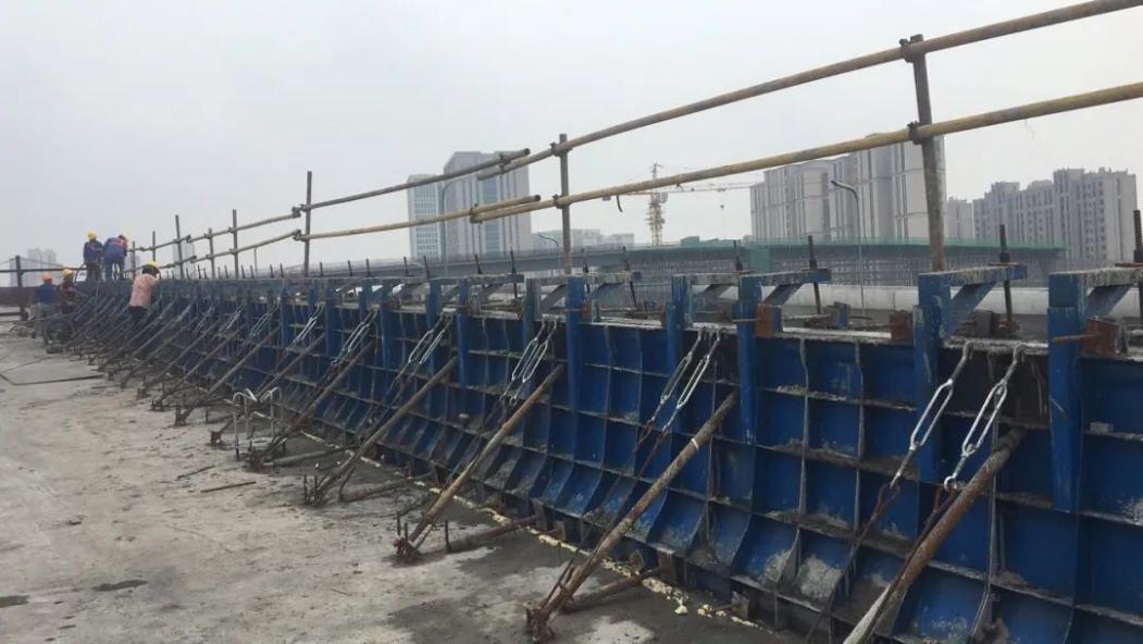 自防撞護(hù)欄施工以來,項(xiàng)目部多措并舉,綜合管控現(xiàn)場施工安全及質(zhì)量,保證橋面系及防撞護(hù)欄施工穩(wěn)步推進(jìn)。面對防撞護(hù)欄施工圓曲線半徑較小、鋼筋預(yù)埋準(zhǔn)確度控制難度大、鋼筋線型調(diào)整難度大等難題,從測量放線、立模校正到澆筑砼,全程設(shè)專人盯控,嚴(yán)格“三檢”制度,堅持“樣板引路”,抓好質(zhì)量管控。同時,多次組織召開防撞護(hù)欄“回頭看”等專題會議,不斷總結(jié)經(jīng)驗(yàn)、優(yōu)化施工方案,平穩(wěn)有序推進(jìn)施工進(jìn)度。