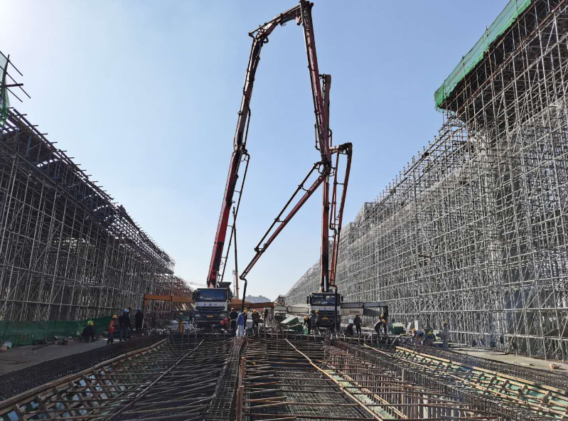 為保證項目工期,項目部統(tǒng)籌兼顧,積極謀劃,在保證橋面附屬工程施工的同時,也保證了箱梁施工工作的穩(wěn)步推進。每一次澆筑前,對施工班組進行質(zhì)量安全技術交底,嚴格過程控制和工序銜接,確保工程質(zhì)量;現(xiàn)場施工嚴格按照專項方案,現(xiàn)場技術負責人對每道工序進行嚴格審核,牢牢把關,以“高標準,嚴要求”進行每道工序的驗收;項目成立黨員先鋒隊和青年突擊隊,黨員領導干部沖鋒在前,全體參建人員迎難而上,緊盯節(jié)點,細化措施,落實責任,強力推動工程順利進展;同時,現(xiàn)場施工人員積極主動爭取一切有利條件,攻堅克難,搶抓時機,多措并舉,合理配置資源,全力保障每一聯(lián)現(xiàn)澆箱梁的順利澆筑。此次主線現(xiàn)澆箱梁的澆筑完成,為項目全面進入附屬工程施工、完成整體目標任務奠定了堅實的基礎。截止日前,工程全部66聯(lián)現(xiàn)澆箱梁,已澆筑61聯(lián);支架已全部搭設完成;附屬工程防撞護欄已完成9800米,完成64.1%;橋面鋪裝已完成48聯(lián),完成64%;正在進行瀝青攤鋪準備工作,各工序施工正穩(wěn)步推進中。