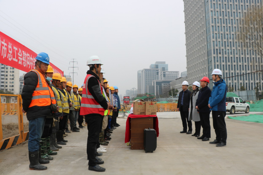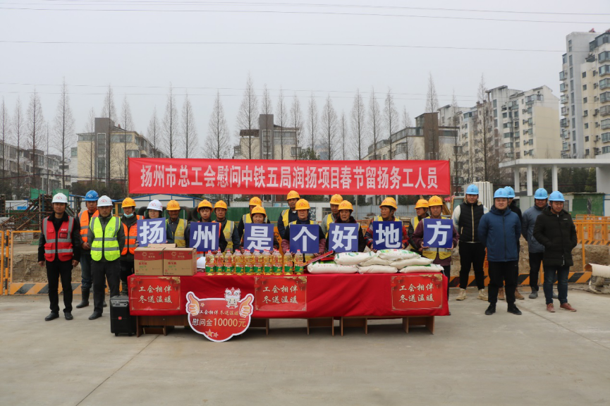 2月5日下午,揚(yáng)州市總工會(huì)副主席洪慧娟一行來到潤揚(yáng)路快速化改造工程施工現(xiàn)場,看望慰問春節(jié)留揚(yáng)務(wù)工人員。
