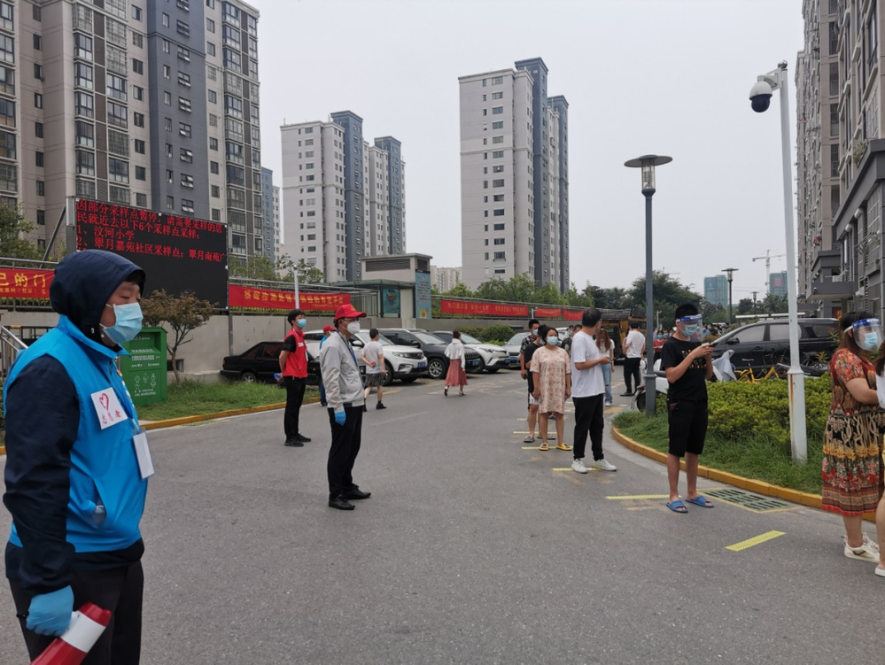 “請大家排好隊,保持一米以上安全距離,不要造成人員聚集,請?zhí)崆皽?zhǔn)備好你的身份證……”志愿者不斷提醒居民注意。在翠月花園核酸采集點,志愿者們穿梭在排隊人群中,邊安撫居民緊張情緒,邊引導(dǎo)居民即測即走?!半m然天氣很悶熱,工作量很大,但是我們有信心能保質(zhì)保量完成全小區(qū)核酸檢測任務(wù)。”他們不顧喉嚨嘶啞,依舊熱情且耐心地回答居民的問題,引導(dǎo)現(xiàn)場秩序。11日下午,雨淅淅瀝瀝下個不停。雖然避雨棚近在咫尺,但志愿者們面對風(fēng)雨寸步不離崗位,他們笑著說道“這點風(fēng)雨算啥呀?”一周來,志愿者們協(xié)助社區(qū)開展了4次核酸檢測,共檢測居民約12000人次。