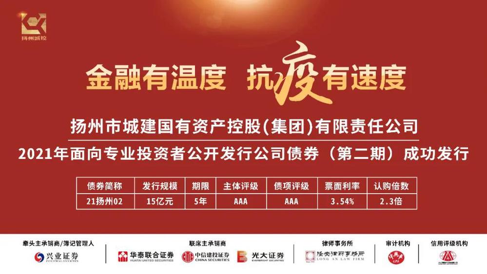 近日,城控集團(tuán)2021年第二期15億元公司債成功簿記發(fā)行,期限5年,票面利率3.54%,創(chuàng)集團(tuán)2017年以來同期限債券發(fā)行利率新低!本期債券募集資金將用于集團(tuán)民生保供、日常經(jīng)營等。