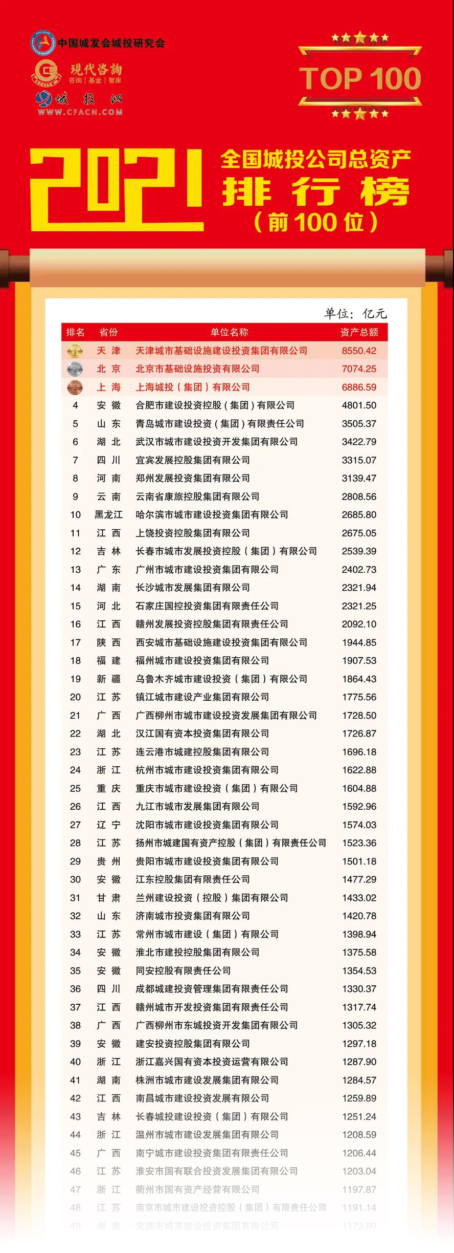 該排行榜由中國(guó)城市發(fā)展研究會(huì)城市建設(shè)投融資研究專業(yè)委員會(huì)(簡(jiǎn)稱”中國(guó)城發(fā)會(huì)城投研究會(huì)”)、江蘇現(xiàn)代資產(chǎn)投資管理顧問有限公司(簡(jiǎn)稱“現(xiàn)代咨詢”)和城投網(wǎng)聯(lián)合發(fā)布,迄今已連續(xù)發(fā)布8年,主要反映全國(guó)城投公司規(guī)模變化的總資產(chǎn)排名情況,目前已成為全國(guó)城投行業(yè)群體發(fā)展?fàn)顩r和城投轉(zhuǎn)型升級(jí)的權(quán)威發(fā)布。