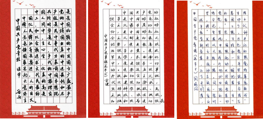 文字入手、意識入腦、責任入心。支部黨員利用工作之余,以《中國共產黨章程(修正案)》為藍本,堅持一筆一畫工整書寫黨章,一字一句銘記黨章條款,熟悉掌握黨章主要內容,深入領會黨章內涵、精神實質以及對共產黨員的職責要求。全體黨員抄黨章、學黨章、悟黨章,內外一心,共同在抄寫中提升黨性,鑄造黨魂。
