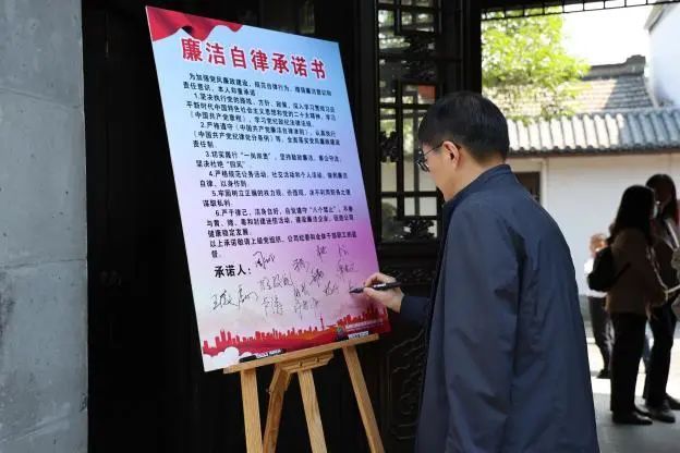 在斗野亭的長廊,大家分享了廉政書籍,互贈了“廉”花,進行了廉政交流,簽署了廉潔自律承諾書。大家紛紛表示:“在今后的工作生活中,要一身正氣、堅守本心;要頭頂理想、胸懷信仰;要主動擔(dān)當(dāng)、知行合一?!?/p>