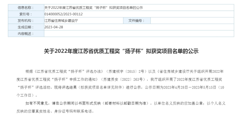 “揚(yáng)子杯”由江蘇省住建廳、江蘇省建筑工程管理局、江蘇省建筑行業(yè)協(xié)會(huì)組織評(píng)選,是全省建筑工程質(zhì)量最高榮譽(yù)獎(jiǎng),評(píng)選對(duì)象為省內(nèi)已經(jīng)建成并投入使用的各類建設(shè)工程,每年評(píng)審一次,實(shí)行獲獎(jiǎng)項(xiàng)目總量控制,當(dāng)年獲獎(jiǎng)總量不超過(guò)上一年度竣工驗(yàn)收項(xiàng)目數(shù)量的百分之一。