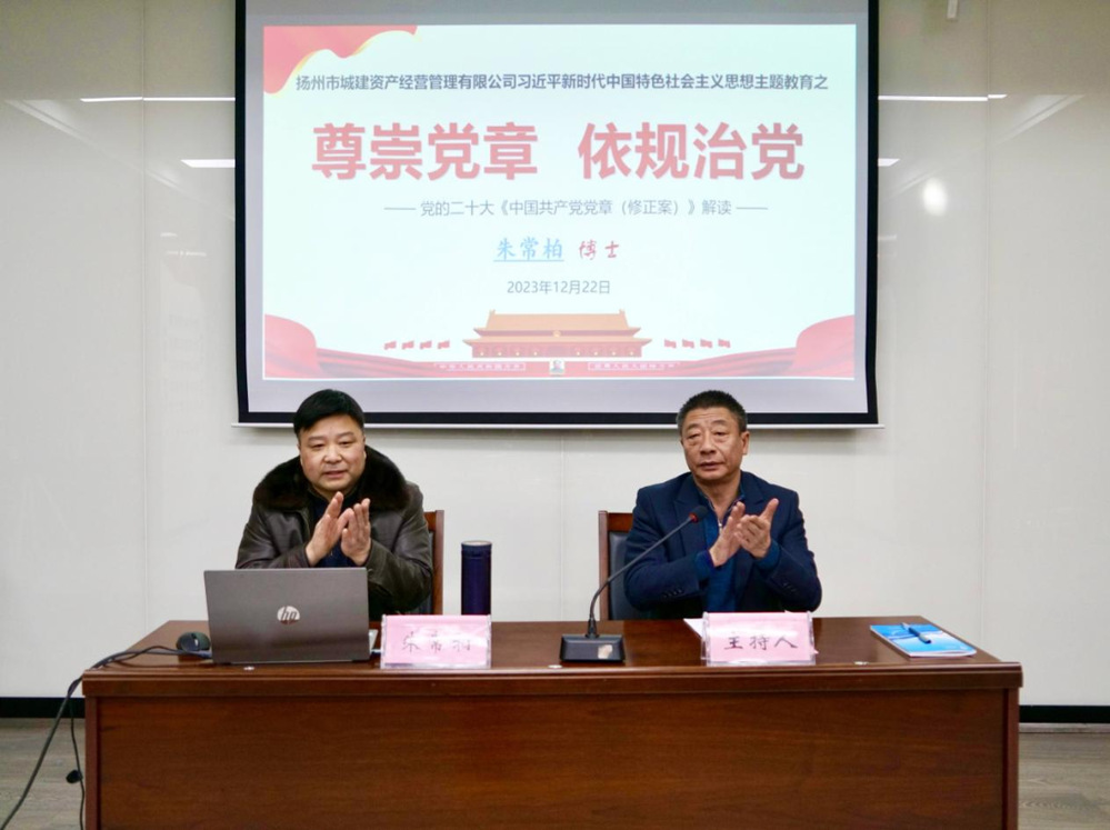 揚(yáng)州大學(xué)法學(xué)博士、副教授、碩士生導(dǎo)師朱常柏博士以《尊崇黨章 依規(guī)治黨》為題,為大家進(jìn)行了學(xué)黨章專題輔導(dǎo),并根據(jù)新修訂的《中國(guó)共產(chǎn)黨章程》,對(duì)“黨章的地位與作用”“黨章的結(jié)構(gòu)與內(nèi)容”“黨章修正若干要點(diǎn)”三個(gè)方面作了重點(diǎn)解讀。朱博士講解風(fēng)格生動(dòng)幽默,內(nèi)容結(jié)構(gòu)脈絡(luò)清晰,理論與實(shí)際相聯(lián)系、歷史與現(xiàn)實(shí)相對(duì)照,引導(dǎo)我們要時(shí)刻做到心中有黨、在黨言黨、對(duì)黨忠誠(chéng),進(jìn)一步增強(qiáng)尊崇黨章、遵守黨章、維護(hù)黨章的自覺(jué)性和堅(jiān)定性,真正把黨章黨規(guī)內(nèi)化于心、外化于行。