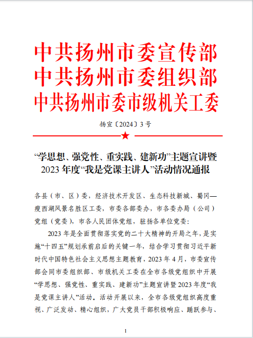 近日,市委宣傳部、市委組織部、市級機關(guān)工委下發(fā)了《“學(xué)思想、強黨性、重實踐、建新功”主題宣講暨2023年度“我是黨課主講人”活動情況通報》,城控集團選送的2名選手——揚州市城建置業(yè)有限公司刁藝璇、江蘇長江水務(wù)股份有限公司張薇被評為2023年度揚州市“優(yōu)秀黨課主講人”。
