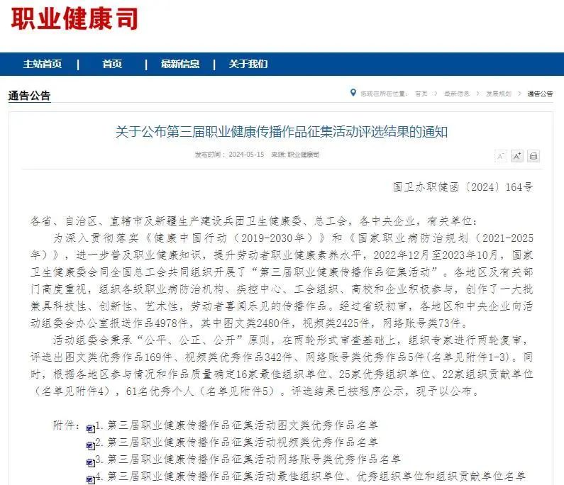 為深入貫徹落實(shí)《健康中國行動(dòng)(2019-2030年)》和《國家職業(yè)病防治規(guī)劃(2021-2025年)》,進(jìn)一步普及職業(yè)健康知識(shí),提升勞動(dòng)者職業(yè)健康素養(yǎng)水平,國家衛(wèi)生健康委、全國總工會(huì)共同組織開展了“第三屆職業(yè)健康傳播作品征集活動(dòng)”。我公司積極創(chuàng)作,踴躍參與征集活動(dòng),選送的《共享職業(yè)健康 共創(chuàng)健康水務(wù)》經(jīng)過初審、形式審查和專家評(píng)審等程序,入圍獲獎(jiǎng)名單。