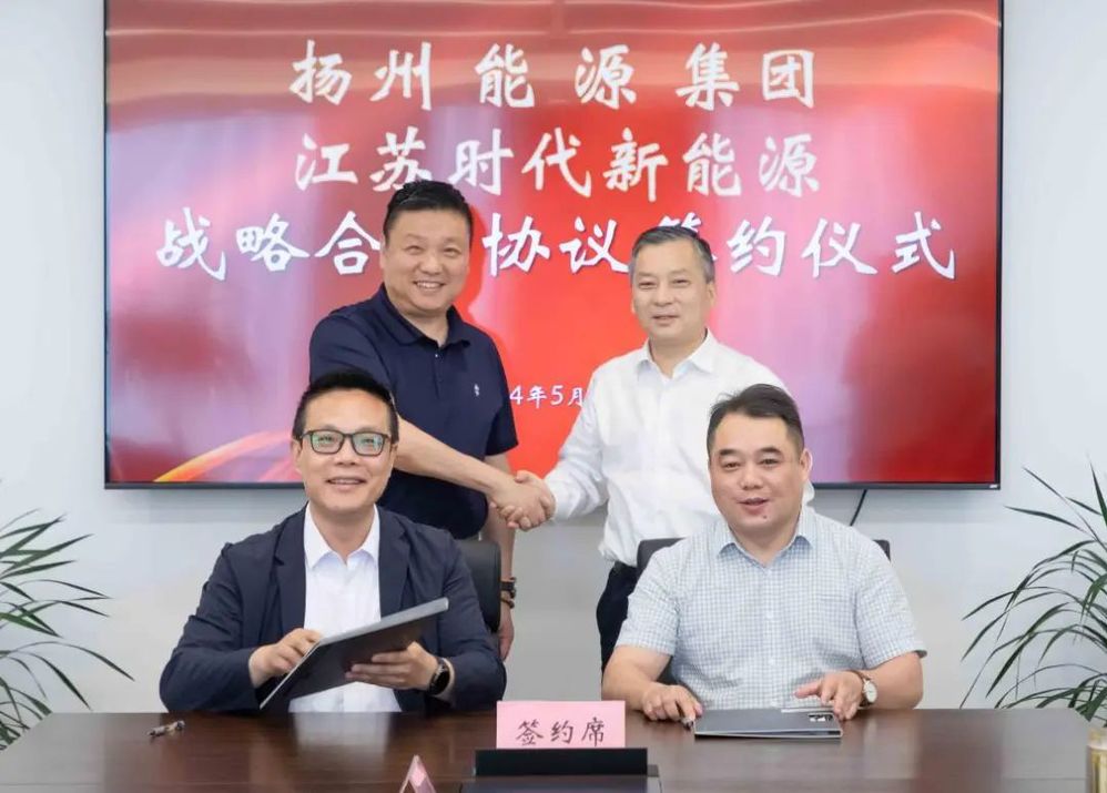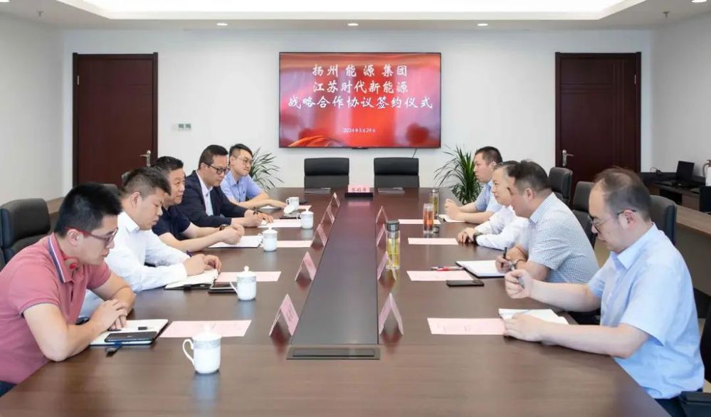 5月29日下午,揚(yáng)州能源集團(tuán)與江蘇時(shí)代新能源科技有限公司簽訂發(fā)展合作框架協(xié)議,城控集團(tuán)副總經(jīng)理、能源集團(tuán)董事長(zhǎng)孔德存與寧德時(shí)代區(qū)域總經(jīng)理陳凌出席簽約儀式。
