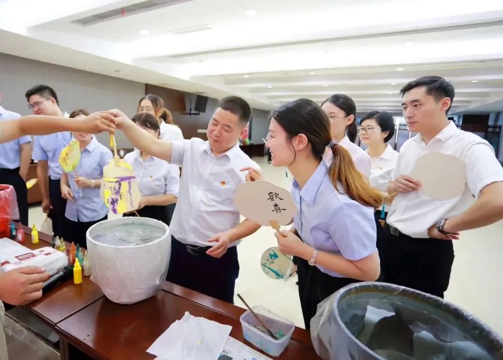 以漆為筆,以水為墨。揚州中燃公司現(xiàn)場邀請所有參加人員,動手體驗非遺漆扇的魅力。大家在挑選了心儀的顏色后,在老師的指導(dǎo)下,將稀釋好的色漆小心翼翼地滴灑在水面上進行設(shè)計制作,將白色扇面緩緩浸入水中,或旋轉(zhuǎn)、或搖擺,一把把意蘊悠長的漆扇給大家?guī)砹瞬簧俚捏@喜。
