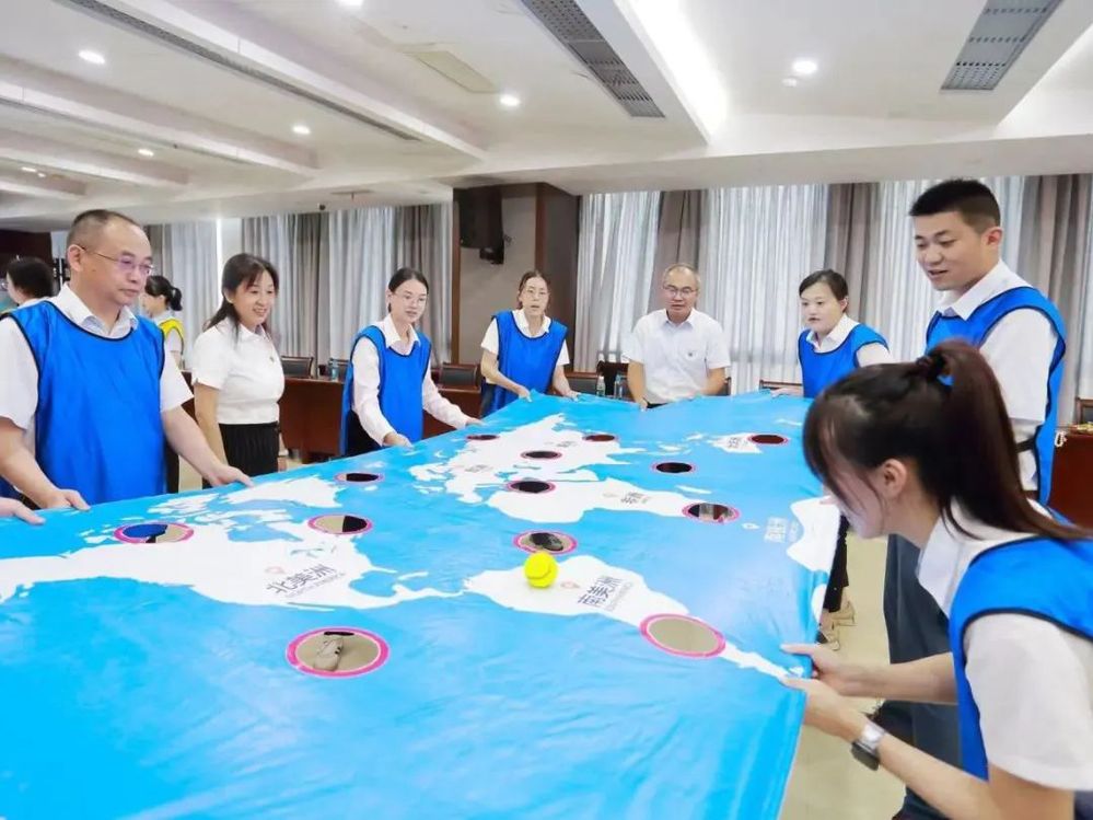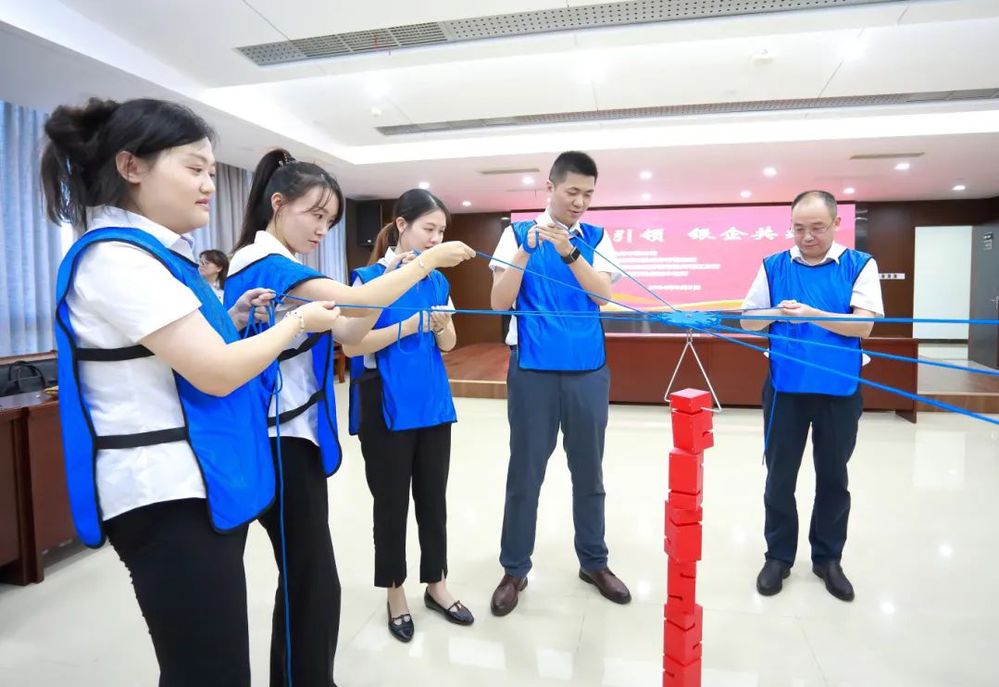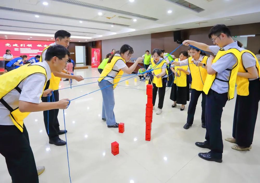此次共建活動在歡快輕松的氛圍中進行,為充分調(diào)動大家的參與熱情,在主持人熱情地引導(dǎo)下,大家首先進行了熱身。熱身活動后,揚州中燃公司和三家銀行組建三支團隊依次開展“環(huán)游世界八十天”、“達(dá)芬奇密碼”、“聯(lián)合攻城”等一系列團隊協(xié)作競賽。大家在競賽互動中不斷磨合,增強了彼此之間的信任感和團隊凝聚力?!奥?lián)合攻城”作為競賽環(huán)節(jié)的最后一個項目,將現(xiàn)場的氣氛推到一個高潮?!奥?lián)合攻城”需要隊員們同時操控手中的繩子,利用三角形的鉤子,將現(xiàn)場的八塊積木堆積成一個柱子,堆積過程中手不可觸碰積木,且柱子不倒塌視為完成競賽,用時最少的隊伍獲勝。這項競賽既考驗了隊員們之間的團隊協(xié)作能力,又考驗了每一位隊員的心理素質(zhì)和應(yīng)對能力,大家在團結(jié)緊張活潑的氣氛中感受著充滿挑戰(zhàn)競賽過程和完成項目的喜悅。