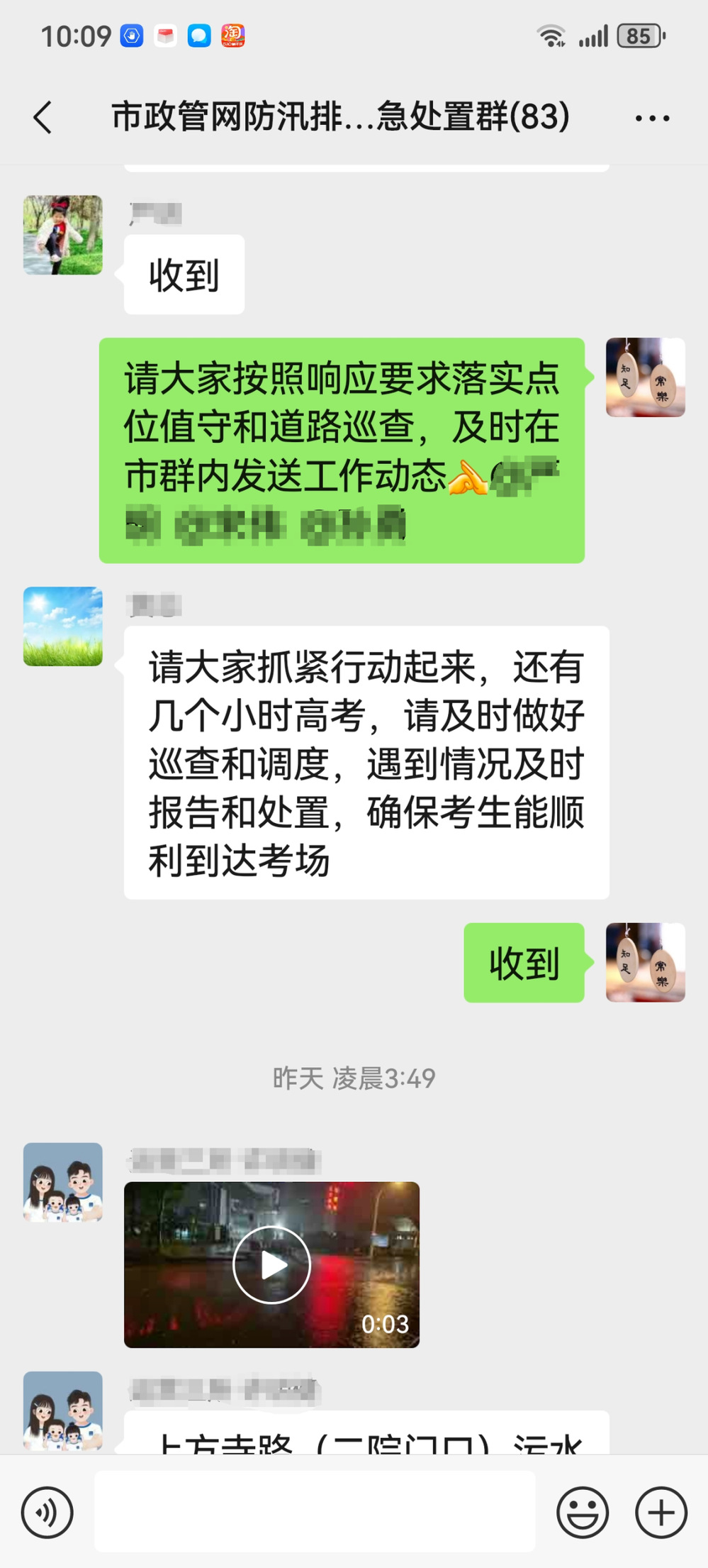 6月6日開(kāi)始,各相關(guān)部門(mén)已根據(jù)天氣預(yù)警按照統(tǒng)一部署和既定安排開(kāi)展污水設(shè)施加密巡查,部署好應(yīng)急人員、物資隨時(shí)待命。6月7日凌晨3時(shí)23分氣象部門(mén)發(fā)布暴雨藍(lán)色預(yù)警后,公司立即通過(guò)“城排通”系統(tǒng)啟動(dòng)應(yīng)急預(yù)案,快速落實(shí)污水設(shè)施、雨水排口、易積水點(diǎn)和在建工程現(xiàn)場(chǎng)的巡查和應(yīng)急處置工作。由于突降暴雨,市區(qū)部分道路很快出現(xiàn)積水,且涉及多個(gè)高考考點(diǎn)周邊,情況十分緊急,與此同時(shí)氣象部門(mén)緊急升級(jí)發(fā)布暴雨黃色預(yù)警。為及時(shí)做好處置,公司第一時(shí)間調(diào)整了應(yīng)急響應(yīng)等級(jí),通過(guò)“城排通”系統(tǒng)實(shí)時(shí)監(jiān)測(cè)運(yùn)行數(shù)據(jù),加強(qiáng)信息共享和部門(mén)間應(yīng)急聯(lián)動(dòng),適時(shí)調(diào)整運(yùn)行調(diào)控策略,對(duì)發(fā)現(xiàn)的路面積水險(xiǎn)情,迅速指揮、調(diào)度搶險(xiǎn)班組和物資開(kāi)展應(yīng)急排澇。