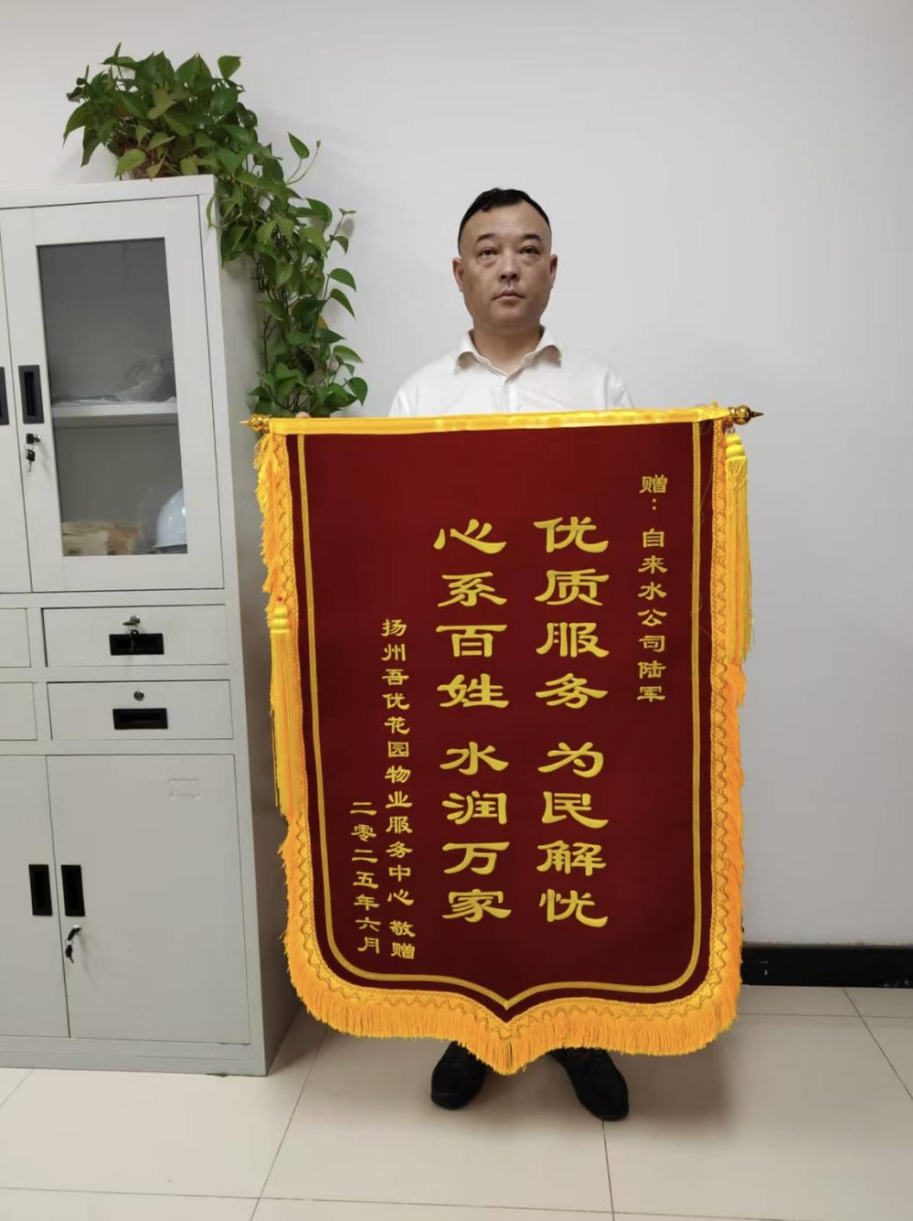 2025年6月13日下午,長江水務(wù)營業(yè)所稽查科迎來一位特殊訪客——吾優(yōu)花園小區(qū)物業(yè)人員。他們?yōu)榛榭瓢嚅L陸軍送來錦旗,致謝其心系用戶、為民解憂的實(shí)干精神。