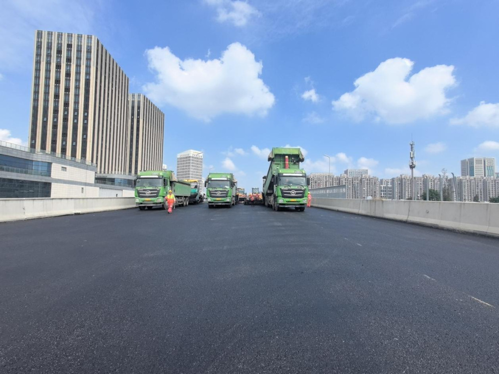 施工過(guò)程中,現(xiàn)場(chǎng)攤鋪機(jī)、壓路機(jī)等設(shè)備有序作業(yè),管理人員對(duì)原材料質(zhì)量、攤鋪溫度、厚度及平整度進(jìn)行嚴(yán)格控制,確保各項(xiàng)施工符合各項(xiàng)規(guī)范要求,為后續(xù)橋面交通標(biāo)志標(biāo)線施劃、智能交通監(jiān)控設(shè)施及亮化設(shè)備安裝打下基礎(chǔ)。