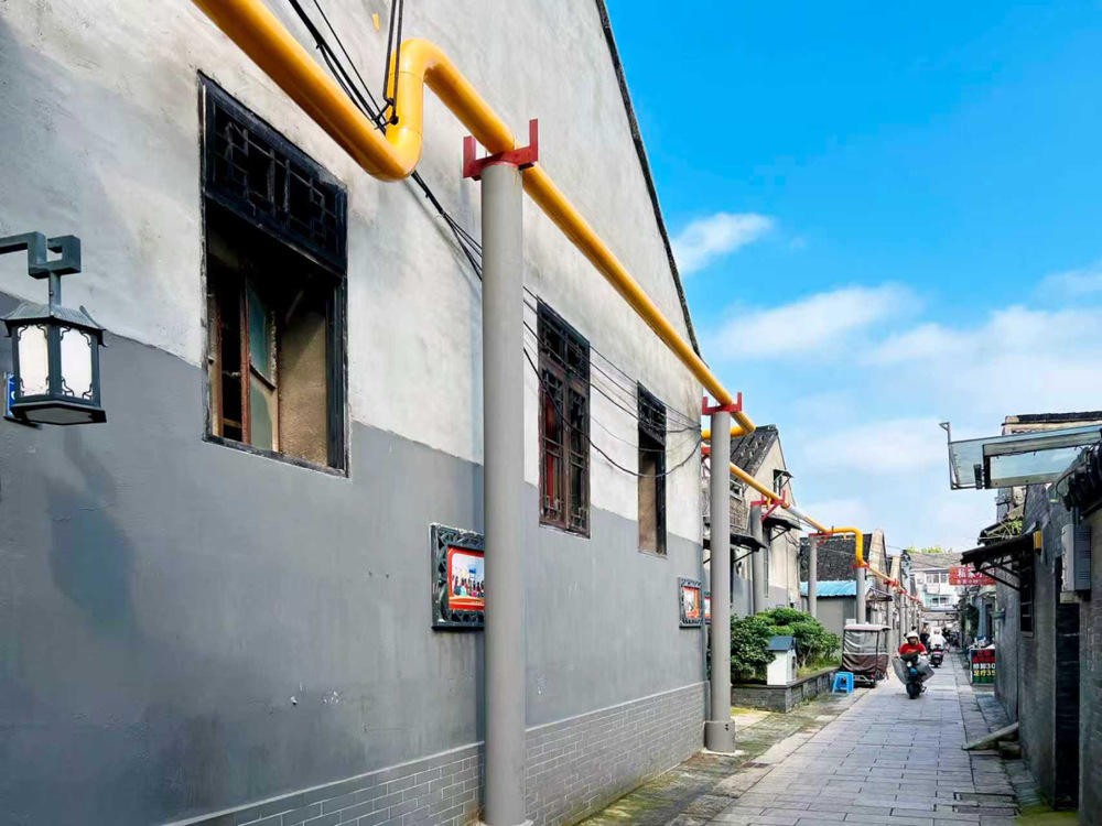 該方案通過精心設(shè)計(jì)與計(jì)算,在無法沿墻敷設(shè)管道的狹窄空間內(nèi),采用設(shè)立專用鋼結(jié)構(gòu)立柱的方式,將燃?xì)夤艿婪€(wěn)固地架設(shè)起來,如同為管道建造了“空中走廊”。這一方法有效規(guī)避了老建筑墻體承重不足、巷道過窄等限制,既保障了管道的安全穩(wěn)固,又最大程度減少了對原有建筑結(jié)構(gòu)和街巷風(fēng)貌的影響。