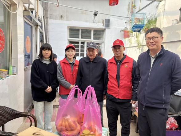 活動中,志愿者們來到兩戶老年人家中,將寓意“步步高升、健康長壽”的重陽糕和米、油、牛奶等慰問品遞到老人手中,與老人們促膝交談,詳細詢問飲食起居與健康狀況,一句句暖心問候、一聲聲真誠祝福,讓老人家中充滿歡聲笑語。